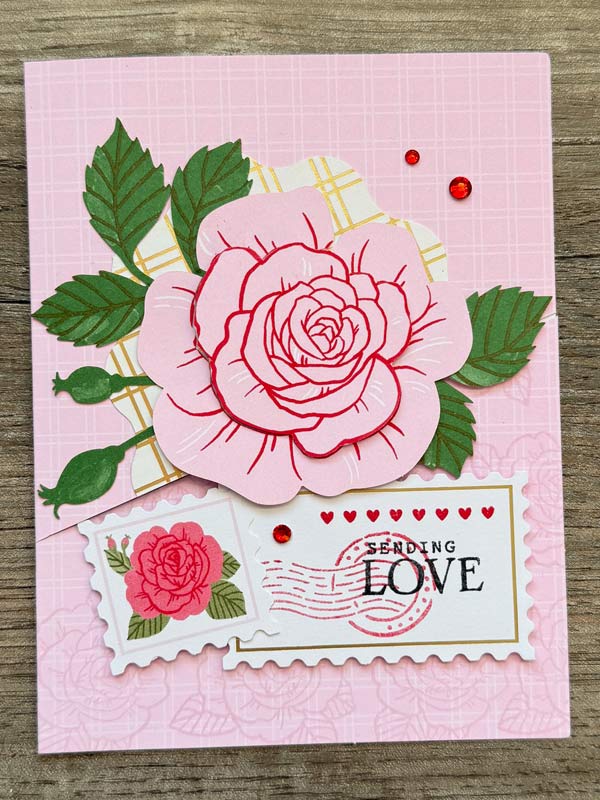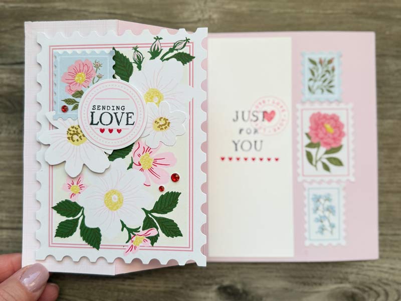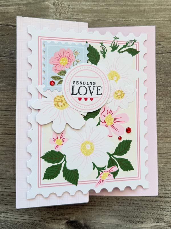 With the printed side of the cardstock facing up, score at 2-1/8″ vertically through the card front. Fold back on this line to create a Z-Fold. Cut the pink envelope apart and cut a 2-1/8″ x 5-1/2″ piece to cover the folded front Attach the large card front only on the half that folds back. Use a 2″ x 5-1/4″ piece of Basic White for inside greeting.